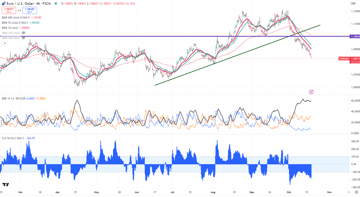 Intraday bias remains bearish as long as resistance holds at 1.1000. The pair is trading below the 34 and 55 EMA, as well as the 200 and 365 Hull moving averages on the 4-hour chart.