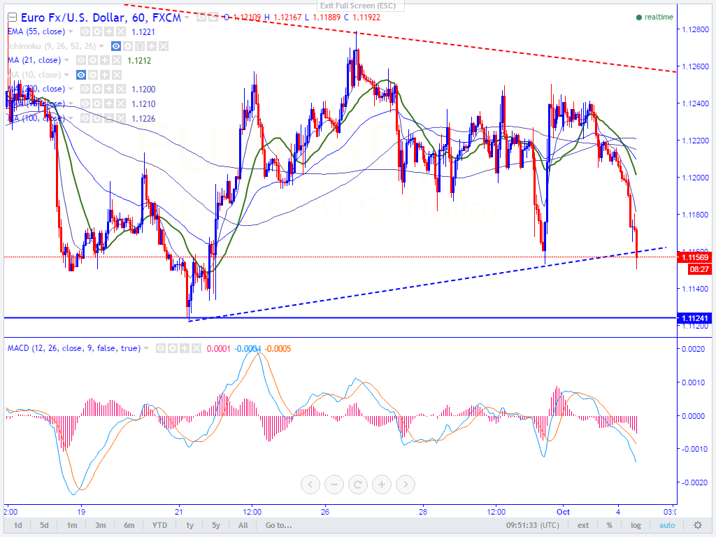 - The pair pared its gains from the high of 1.12507 made on Friday. It has broken the pschycological level of 1.1200 today morning and declined drastically till 1.11639 at the time of writing.