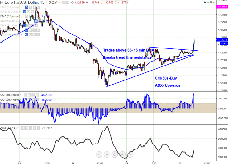 - In 15 min chart the pair is trading above 55- 15 min EMA and also broken trend line resistance. It is good to go long for very short term target of 1.13663.