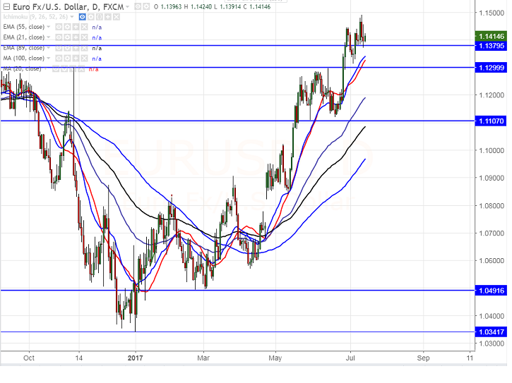 - EUR/USD has formed a minor top around 1.14886 on Jul 12th 2017 and declining for the past two days. The pair hits low of 1.13700 and recovering slightly from that level on rumors that ECB might taper the bond buying program in the coming months.