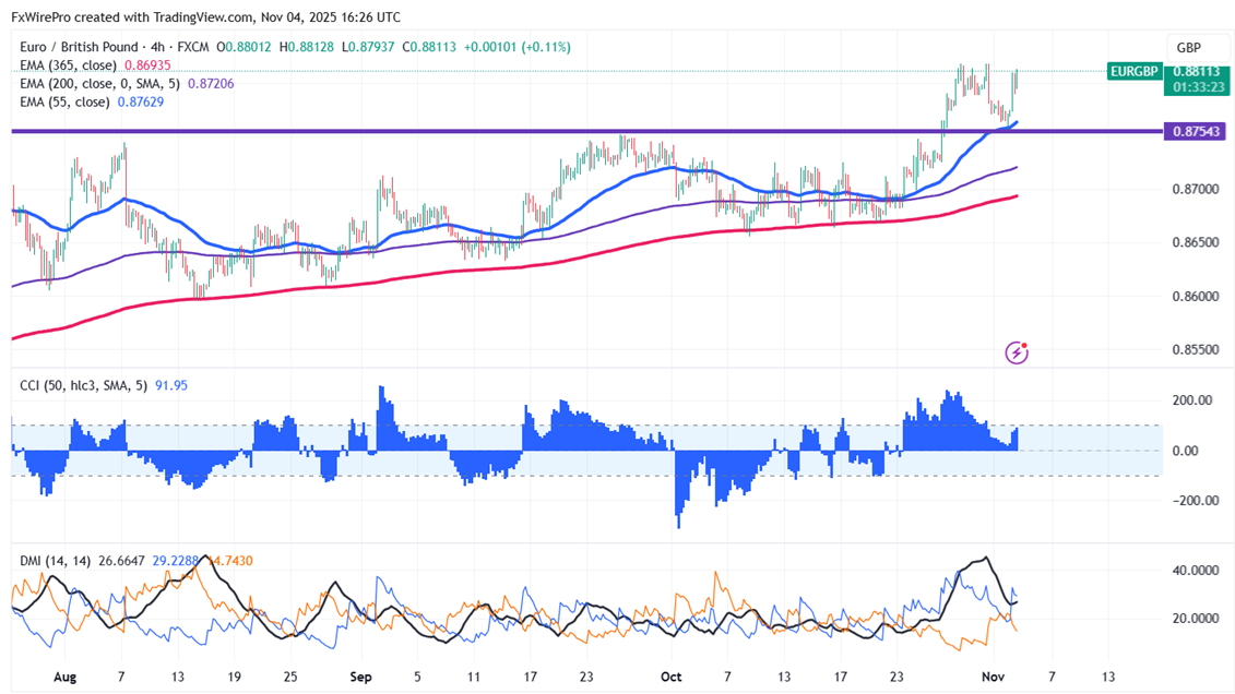 EURGBP took support near 55-4H EMA and showed a minor pullback. As long as support 0.8750 holds, intraday bias is positive. Currently trading at 0.88104, it reached an intraday high of 0.88093.