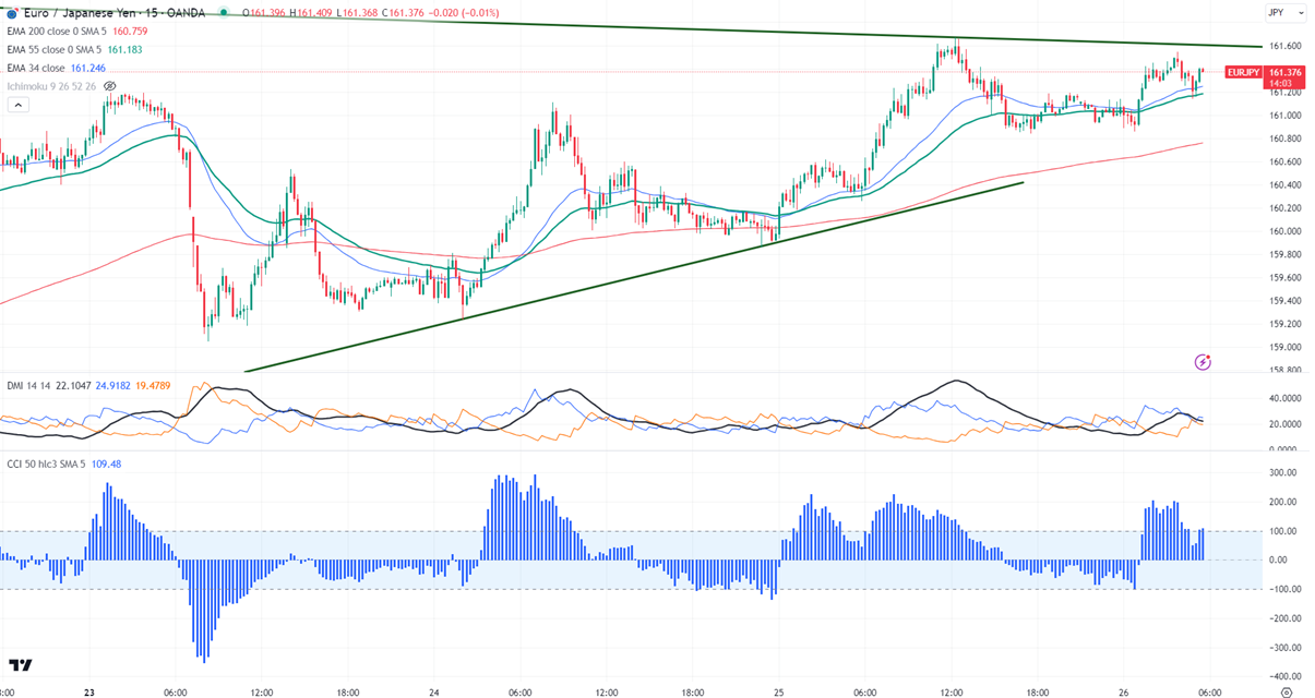 EURJPY pared some of its gains on weak Euro. It hit a low of 160.85 yesterday and is currently trading around 161.32.
