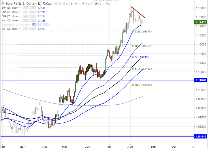 - EURUSD is consolidating after forming a temporary top around 1.19098 on Aug 2nd 2017. The pair declined till 1.16626 yesterday and is currently trading around 1.17501.