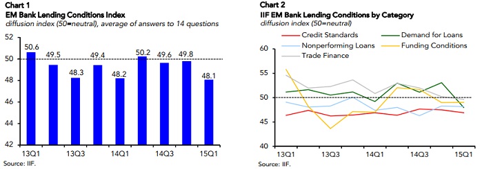 According to survey by Institute for International Finance (IIF), composite index for EM bank lending conditions dropped to 48.1 in first quarter of 2015, lowest level since fourth quarter of 2011.