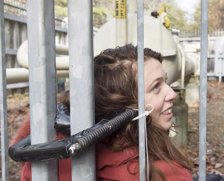 A young woman chains herself to a fence during a 2016 protest in Québec over the Trans-Northern pipeline project. THE CANADIAN PRESS/Ryan Remiorz