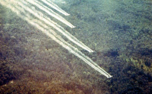 It’s shaky video to begin with but 18 seconds in you see US soldiers spraying Agent Orange during the Vietnam War.