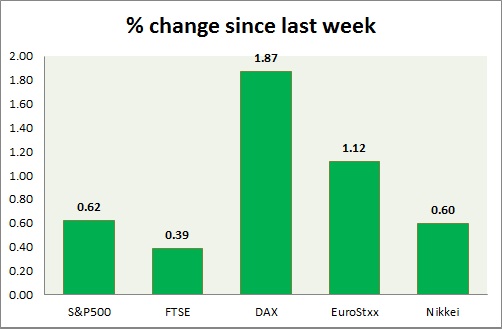 Equities are all trading in green today, as risk aversion from last week failed to gain traction this week and subsided. Performance this week at a glance in chart & table -