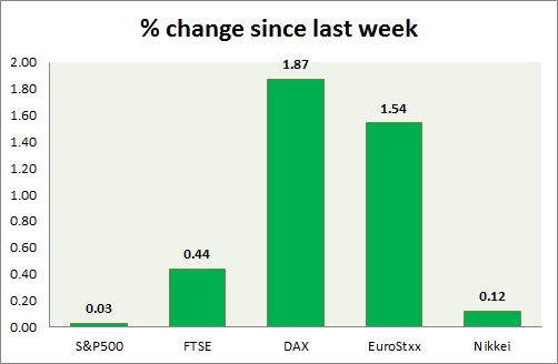 Equities are all trading in green today, with Europe seeming to be more bullish. Performance this week at a glance in chart & table -