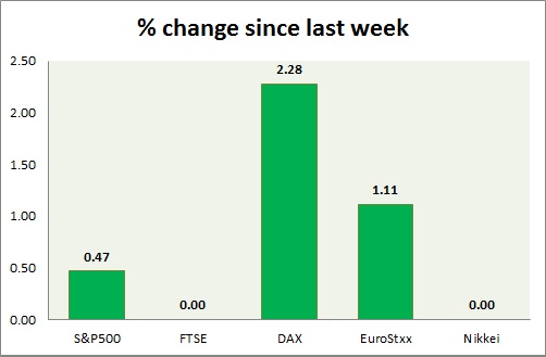 Equities are all trading in green today, after massive selloff of last week. Performance this week at a glance in chart & table -