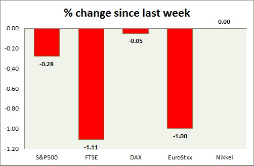 Equities are back in red driven by risk aversion ahead of UK election and default talks over Greece. Performance this week at a glance in chart & table -