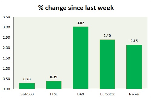 Equities are mostly flat today, after yesterday's massive buying. Performance this week at a glance in chart & table -