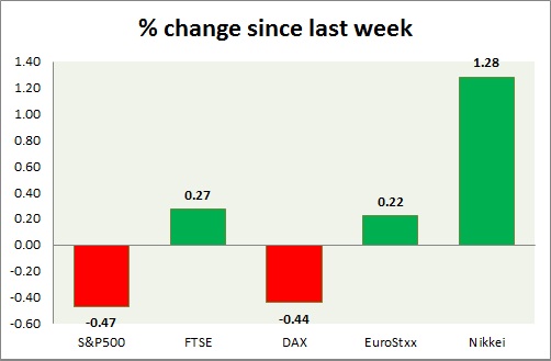Equities are trading in green today. Performance this week at a glance in chart & table -