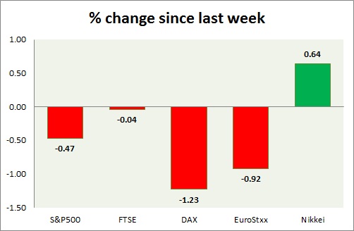 Equities are marginally lower today. Performance this week at a glance in chart & table -