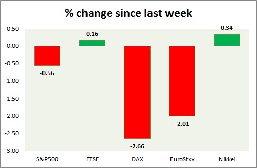 Equities are trading in red today. Performance this week at a glance in chart & table -