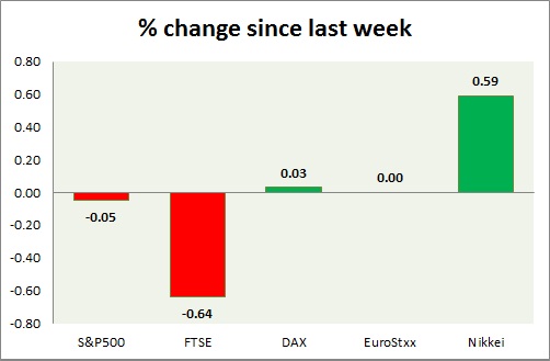 Equities are mixed across globe today. Performance this week at a glance in chart & table -