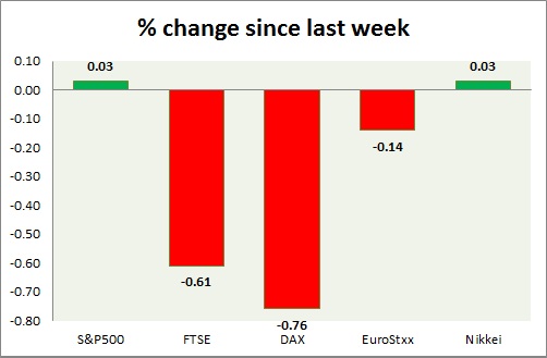 Equities are red across globe today. Performance this week at a glance in chart & table -
