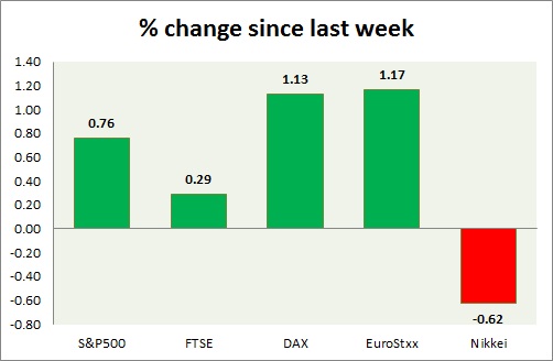 Equities are trading in green today as risk aversion subsided further. Performance this week at a glance in chart & table -