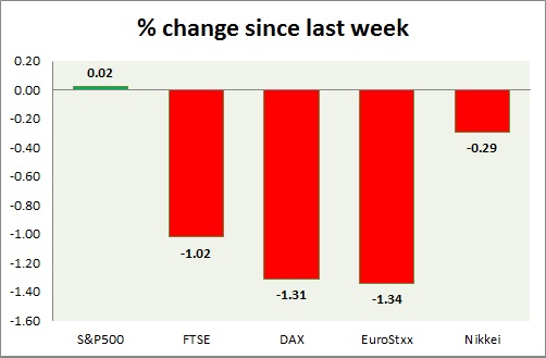Equities are trading in red as big buying as hit market as fear of Greek contagion subsided. Performance this week at a glance in chart & table -