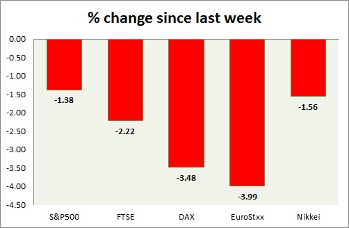 Equities are all trading in red as massive risk aversion hits market. Performance this week at a glance in chart & table -
