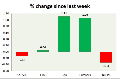 Equities are mixed across globe today. Performance this week at a glance in chart & table -