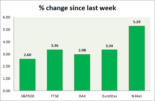Equities are all trading in green today. Performance this week at a glance in chart & table -