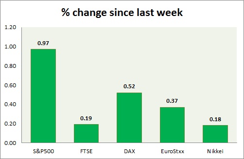 Equities are all trading in green today. Performance this week at a glance in chart & table -