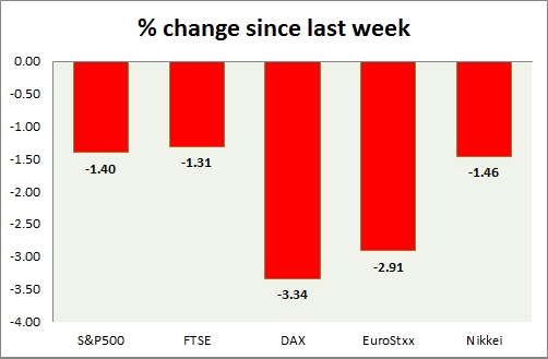 - German DAX is down (-0.55%), France's CAC40 is down (-0.85%), Italy's FTSE MIB is down (-0.45%), Spain's IBEX is down (-0.65%).