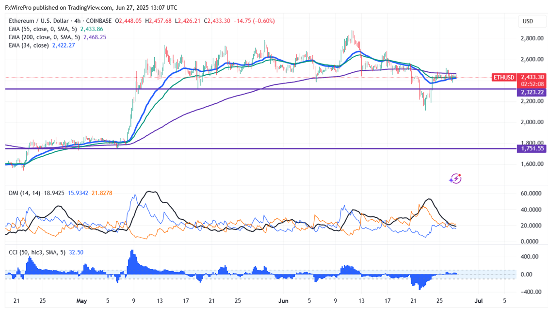 ETHUSD is consoliating in a narrow range after a minor pullback. It hits an intraday low of $2381 and is currently trading around $2432.