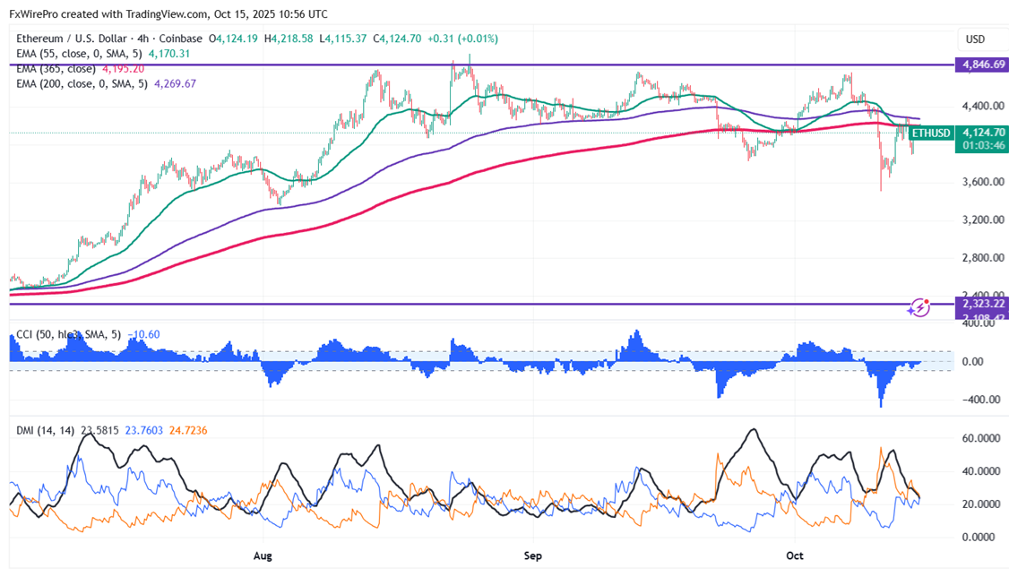ETHUSD trades flat with positive bias on strong institutional demand. It hits an intraday high of $4218 and is currently trading around $4122.70.