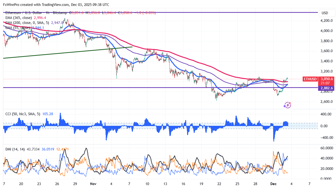 Following Bitcoin's path, ETHUSD holds above $3,000. Its intraday high of $3,086 is being traded presently near $3,051.40.