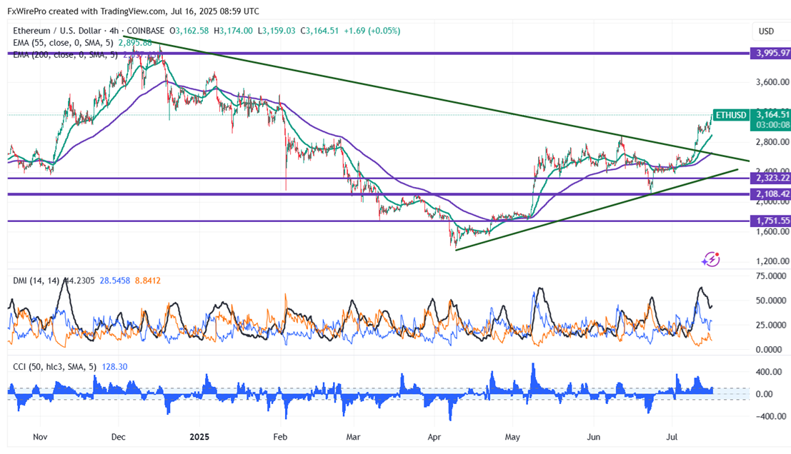 ETHUSD surges above $3100 on ETH ETF inflows. It hits a high of $3166 and is currently trading around $3162.
