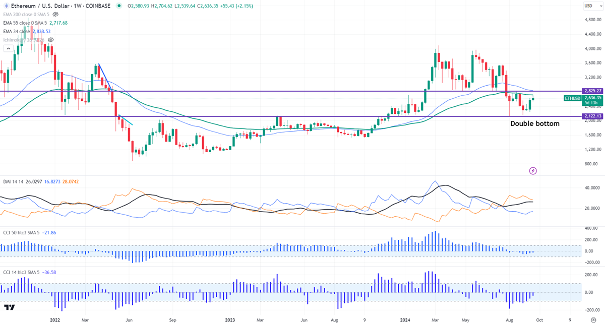ETHUSD showed a minor pullback after forming a double bottom around $2100.It hit a high of $2704 at the time of writing and is currently trading at around $2649.