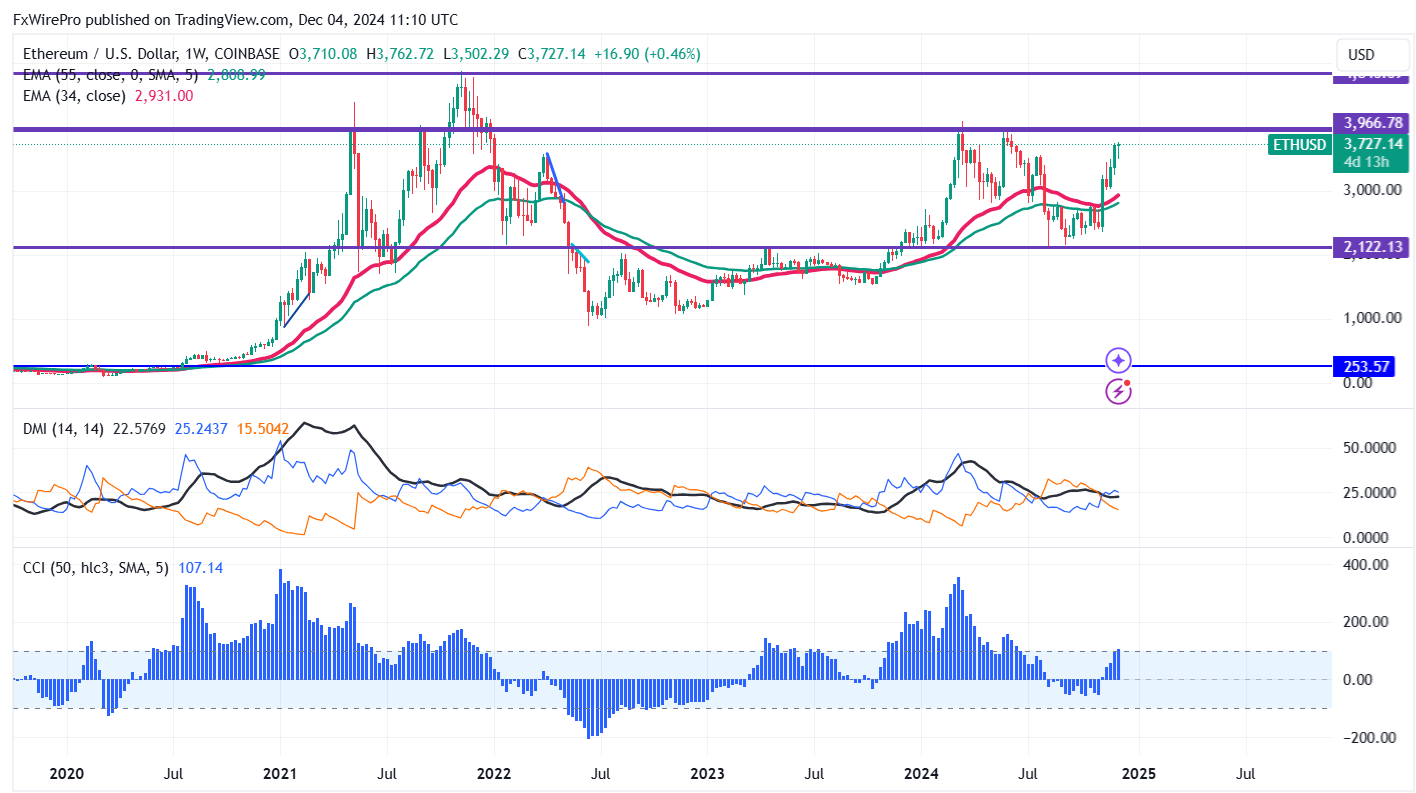 Ethereum gained momentum as investors shift money to ETH and other altcoins from BTC. It hit a high of $3,744 at the time of writing and is currently trading at around $3726.