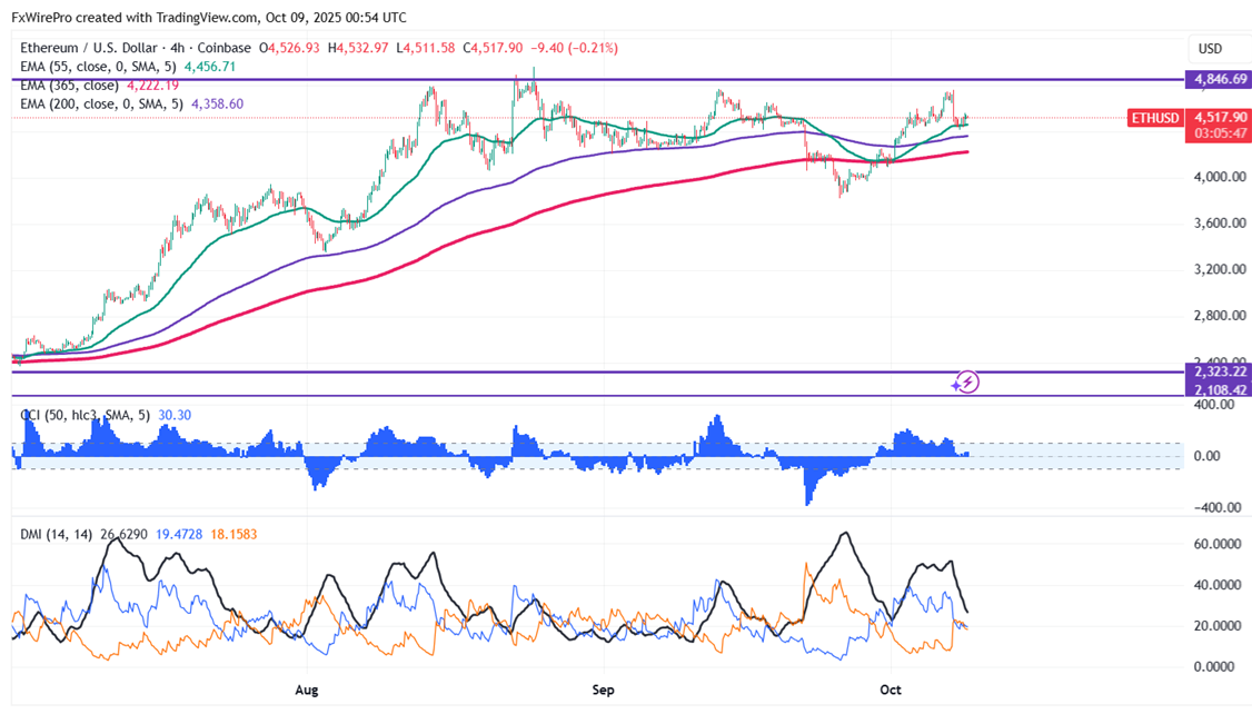 ETHUSD surged past $4500 on strong institutional demand. It hits an intraday high of $4619 and is currently trading around $4586.