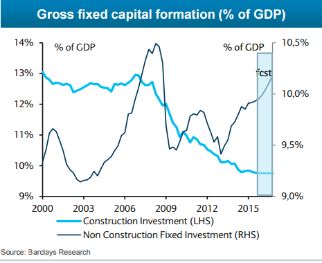 In Q1, both investment and public consumption surprised to the upside. Gross fixed investment grew by 0.8% q/q, its strongest pace since Q1 11, as both construction and productive investment were up. Although it may be premature to draw strong conclusions from that rebound, this could be related to the better growth outlook and to very easy financial conditions, which may eventually translate into some willingness to expand production capacity.