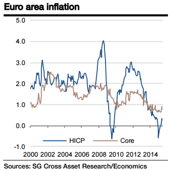 According to Societe Generale, the euro area HICP inflation to average 0.3% in 2015 and 1.5% in 2016, while the core metric should remain stable at 0.8% in 2015 and 1.1% in 2016.