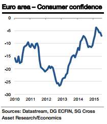 "However, since May, consumer confidence in the euro area has dropped from -3.7 to -7.1 and it is likely to remain unchanged in August on the back of a mixed picture from the real economy. While concerns over the global outlook is likely to impact consumer confidence negatively, improving labour markets and a further decline in oil prices are likely to counterbalance", says Societe Generale.