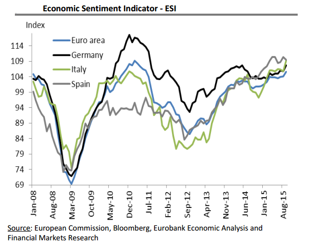 In Greece, the Economic Sentiment Indicator rose by 7.9 points to 83.1 in September from 75.2 in August, increasing for the first time in six months and snapping a downtrend it had embarked on in December 2014. It is worth recalling that Greece's August ESI (75.2) recorded its lowest level since March 2009, following the surprise announcement of the July 5th referendum, the announcement of the temporary bank holiday and the imposition of capital controls on June 28, 2015 that exacerbated the uncertainty about Greece's euro membership. Having said that, there was a sharp decoupling of Greece's Economic Sentiment Indicator from the level recorded by the respective composite euro area sentiment index in August 2015. The successful conclusion of Greece's programme review and the completion of bank recapitalization before end-2015 are expected to further improve economic sentiment in the following months.