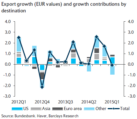 Euro area export growth slowed further in Q1 (0.8% q/q after 1.0% in Q4) reflecting a slump in shipments to several major emerging markets and OPEC countries. Notably, exports to China declined significantly (-4% q/q) after having risen continuously since mid-2012. The biggest decline in export volumes in relative terms, however, continues to be recorded for shipments to Russia, which have fallen by more than 30% so far in 2015 (January-April, y/y). Because of Russia's recession and EU sanctions, lower exports to Russia is likely to subtracted about 0.25% from 2015 GDP growth in Germany, says Barclays.