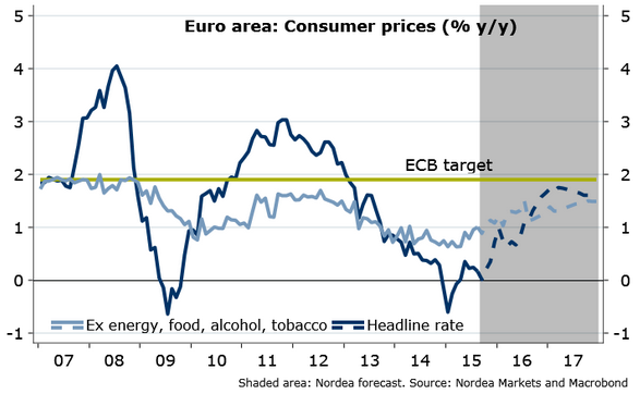 "The current headline inflation rate is just 0.2% y/y. In the short run, the decline in oil prices could easily push it back below zero. Assuming broadly unchanged oil prices over the next months, the inflation rate is likely to rise to roughly 1% y/y by January 2016 as last year's steep fall in energy prices will drop out of the rate and likely to increase by 1.6% in 2017. Later in Q1 next year, base effects will likely drive down the inflation rate again, as oil prices rose markedly in early 2015. This will leave ample room for the ECB to continue with its zero interest rate policy and possibly more aggressive or longer lasting asset purchases", said Nordea Bank in a research note ot its Client.