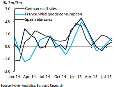 "Hence, although decent euro area growth prospects remain, the recovery is still fragile in the absence of a more stable footing within domestic demand. On a 3m/3m basis, German retail sales and French consumer goods spending accelerated markedly during the summer", states Barclays.