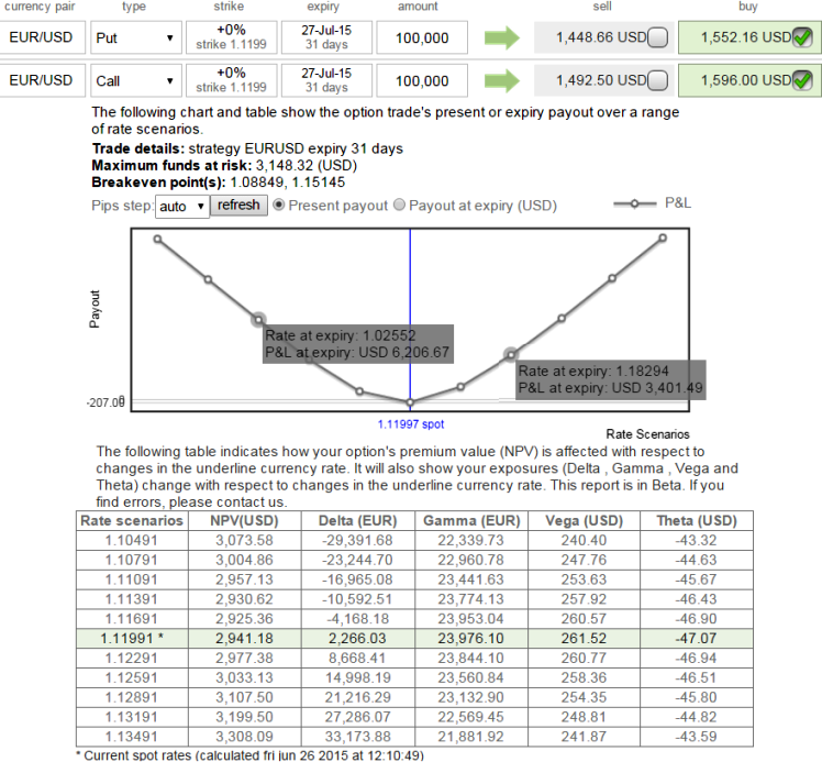 If you expect the underlying currency (EURUSD) to make the downside moves, then buy 2 lots of 15D (1.5%) Out-Of-The-Money puts and sell simultaneously an (1%) In-The-Money put of the same maturity.