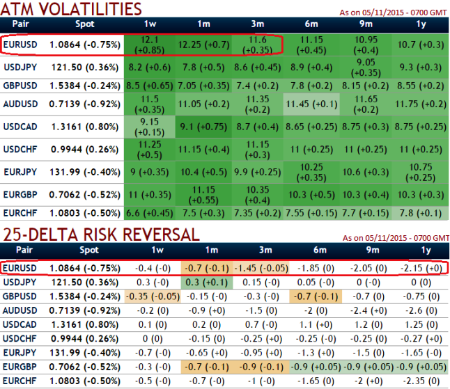 Please have a look at ATM vols and risk reversal nutshell from last week to the current situations. EURUSD still maintains the highest place for implied volatility of 1W at the money contracts among G7 currency space, almost nearing 12%, which is undoubtedly raising higher that is favorable for those look for option writings.