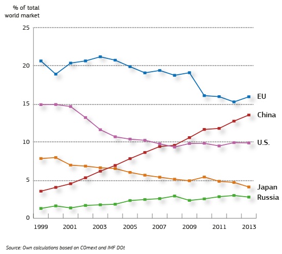 - China - Remarkable rise of China in world market increased its share in world export from 5% to 15% from 1999. China is to suffer big over the Euro's fall as it runs huge trade surplus with Euro zone which is seeing contraction already. Euro in last 12 months fell 22.5% against Yuan.