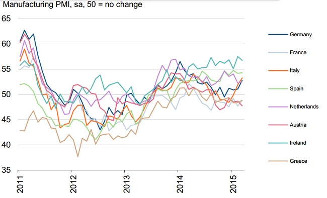 - Ireland and Spain recorded steepest gain in new export business and orders, providing signs that after years of austerity these two following country might actually stand on their own and compete with the core countries like Germany.