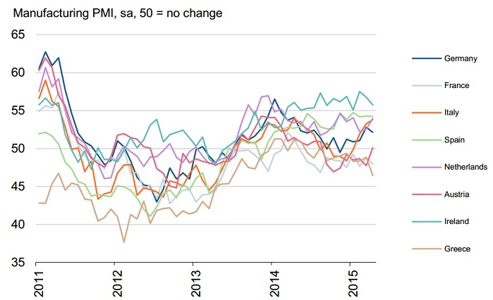 According to data published by markiteconomics Euro zone continued its growth in manufacturing sector as of April, however the pace was dragged down by further slowdown in Greece and France.