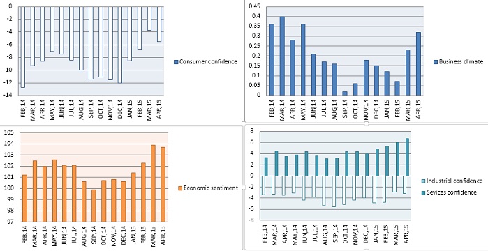 Several sentiment indicators to be released from Euro zone at 9:00 GMT, today. The data most likely to show that sentiment has improved in May in spite of ongoing Greek debt debacle.