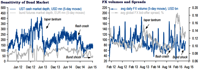 Here are few things that matter FX markets: VaR (Value at Risk) shocks are occurring more frequently; As shown in the 1st chart the bond market's performance in depth seems to decline during each of the episodes (policy changes); While second 2nd chart shows FX volumes sometimes rise and sometimes fall during these shocks.