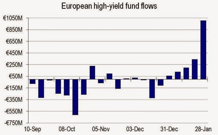 - Chart from JP Morgan, shows Investors are pouring in billions of Euro worth of money. In January alone flow was more than € 1.5 billion.