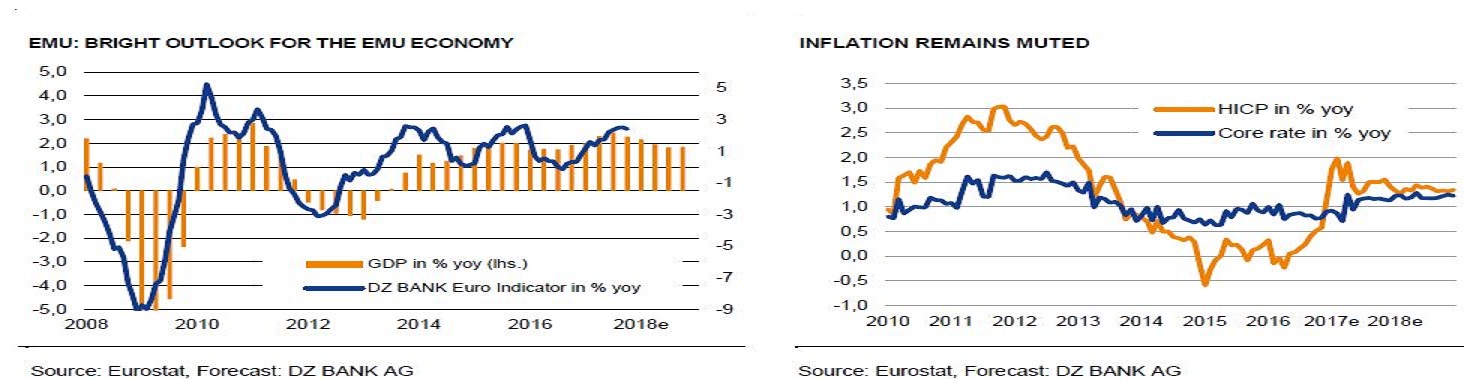 "Overall, the inflation trend remains only moderate despite the positive economic climate. This has prompted us to revise our inflation forecast for the EMU. Consumer prices are likely to increase by only +1.5 percent in 2017 compared to the previous forecast of +1.6 percent, and the average inflation rate in 2018 should now be in the region of +1.2 percent," the report said.